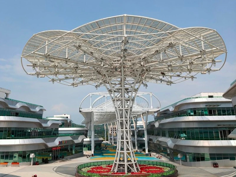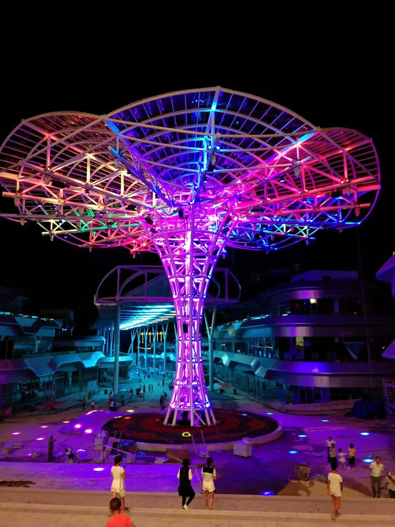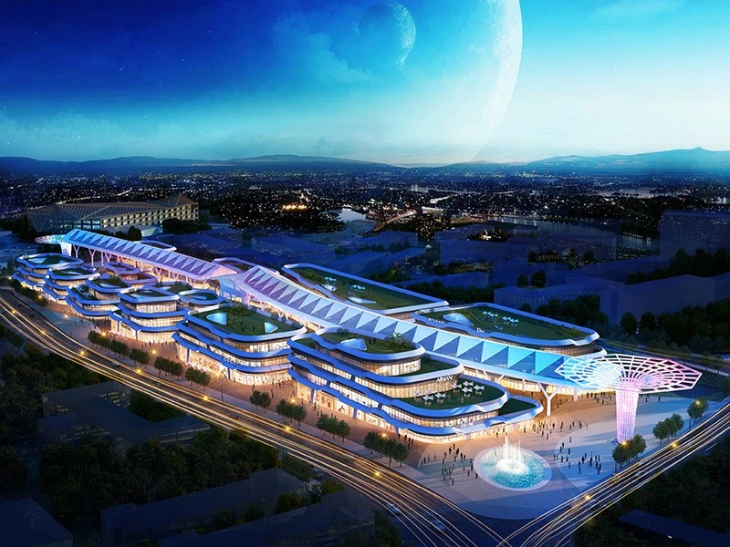平塘县天文小镇天幕街位于贵州省黔南布依族苗族自治州平塘县,商业街设计长度为450米,天幕面积8000平方米,显示屏面积5000平方米。天幕设计分东西区,中间为虫洞,采用三角形拼接,形成龙之逆鳞效果,目前是世界异形天幕中面积最大、长度最长的天幕街。